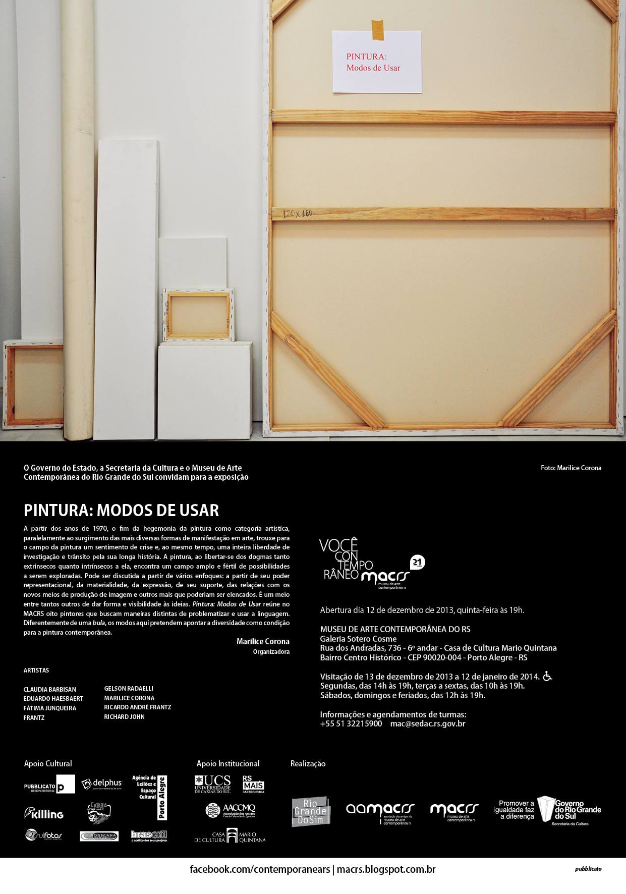 O período de visitação das exposições no MAC RS, na sede CCMQ, é de terça-feira a domingo, das 10h às 19h